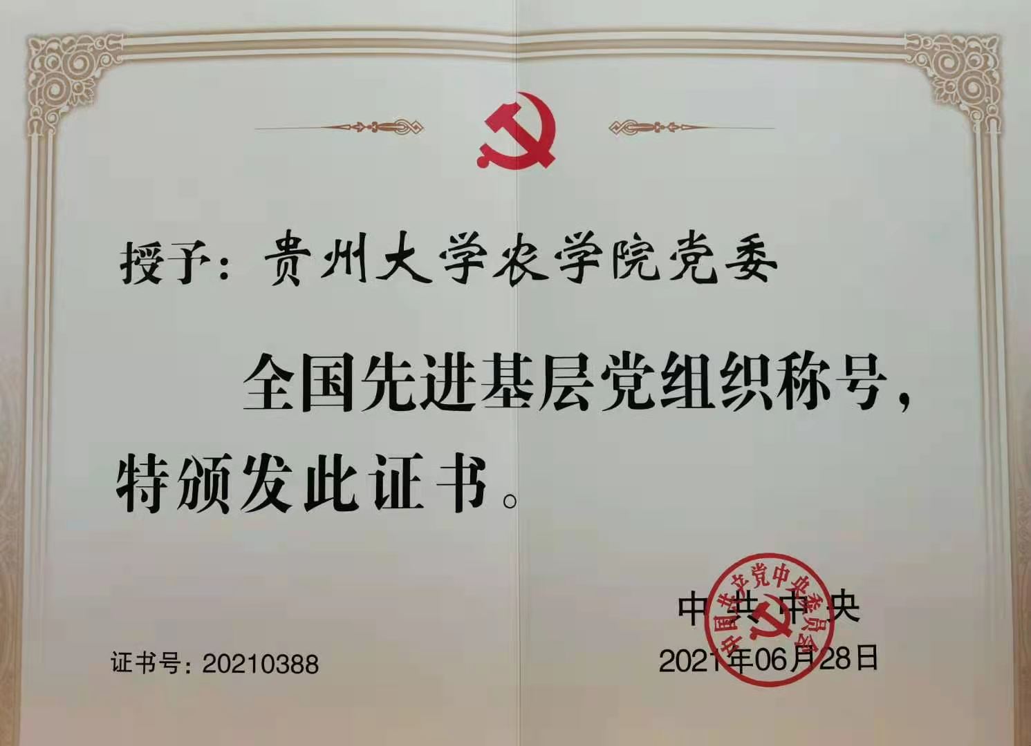 6 月 28 日下午,全国“两优一先”表彰大会在北京人民大会堂隆重举行,贵州大学农学院党委荣获“全国先进基层党组织”荣誉称号,学院党委书记杨刚代表学院党委进京接受表彰。