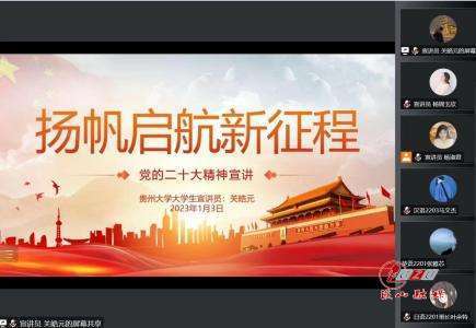 1月3日至1月12日,大学生宣讲团聚焦党的二十大精神的丰富内涵、中国“非凡十年”、贵州“黄金十年”等方面,通过线上会议的形式,为阳明学院、数学与统计学院等6个学院118个团支部的班团干部、入党积极分子开展了主题宣讲,把理论知识用通俗易懂的语言传递给青年。之后,大学生宣讲团计划寒假期间在全校1000多个团支部范围内广泛开展相关宣讲活动,为新学期各团支部开展丰富多彩的党的二十大精神主题团日活动打好理论基础。