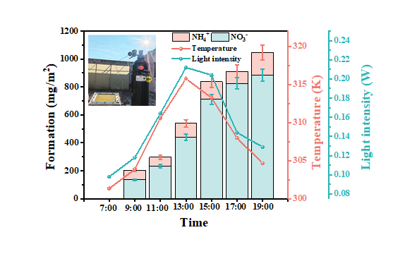 通过“梯度极化”后的材料让团队首次实现无牺牲剂、无共催化剂的光催化全固氮。实验数据显示,在可见光条件下,该材料生成铵根离子和硝酸根离子的产率已超越当前全球所有同类型体系。在自然阳光下,其性能可进一步提升,为技术落地应用奠定核心基础。